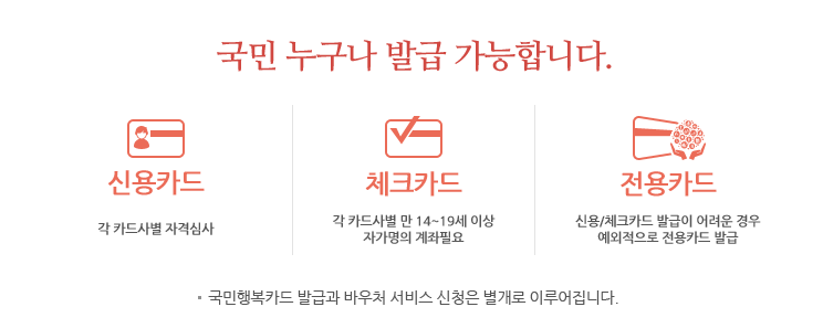 국민행복카드는 신용카드, 체크카드, 전용카드 형태로 발급되며,
