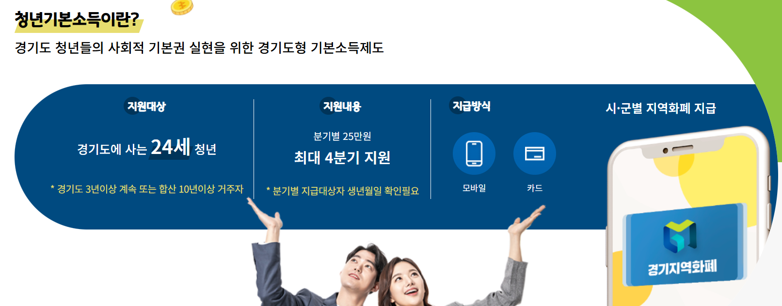 경기도 청년기본소득은 만 24세 청년이라면 누구나 받을 수 있는 대표적인 청년 지원 제도입니다.