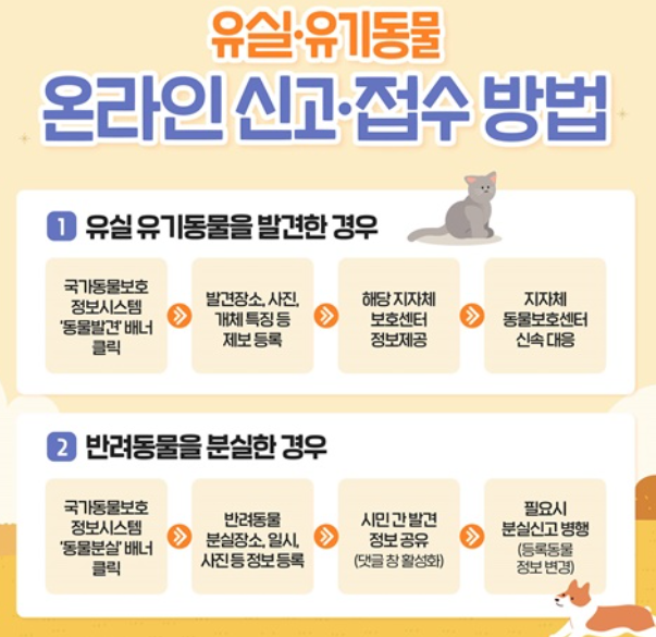 유실 동물 신고: 반려동물을 잃어버렸을 경우 빠르게 신고하고, 구조 동물 정보를 확인할 수 있습니다.