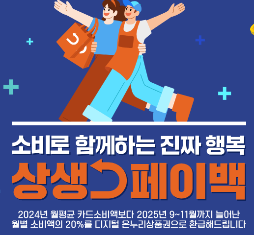 상생페이백은 2025년 9월부터 11월까지 3개월 동안 진행되는 환급 제도입니다. 작년 카드 사용액과 비교했을 때 더 많이 소비한 금액의 20%를 디지털 온누리상품권으로 돌려받을 수 있습니다.