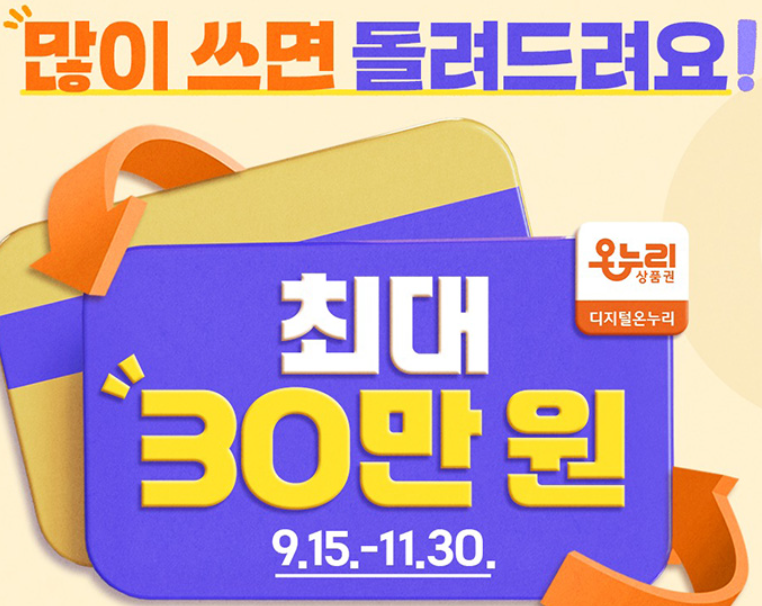예를 들어 2024년에 월평균 100만 원을 썼던 사람이 2025년 9월에 130만 원을 썼다면, 증가분 30만 원의 20%인 6만 원을 상품권으로 받을 수 있는 구조입니다. 매월 최대 10만 원, 총 30만 원까지 환급이 가능해 생활비 절감 효과가 꽤 큽니다.